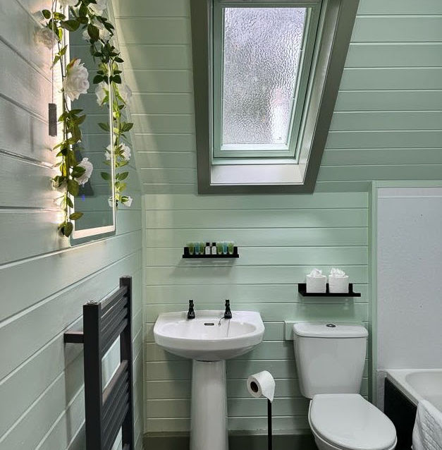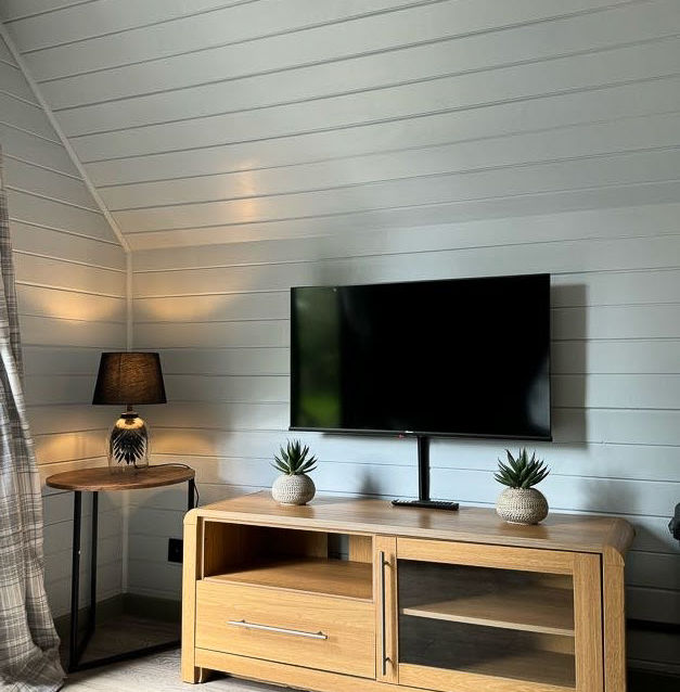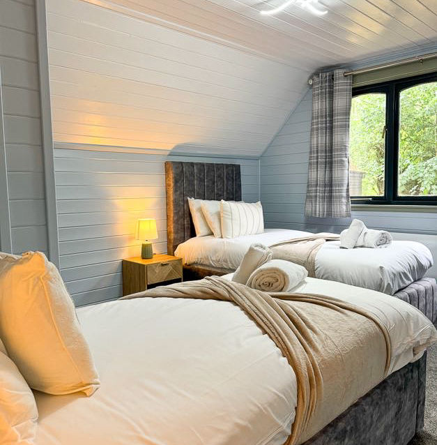 This wood-built lodge sleeps four with a king bedroom, twin room, and open-plan kitchen-dining-lounge. The private deck holds a hot tub; a fenced grass dog run sits just beyond. It's a space designed for guests who appreciate a story beneath their stay, a cabin that feels both here and slightly elsewhere. The name is a nod to the threshold itself—between worlds, between days, between the hot tub and the stars.